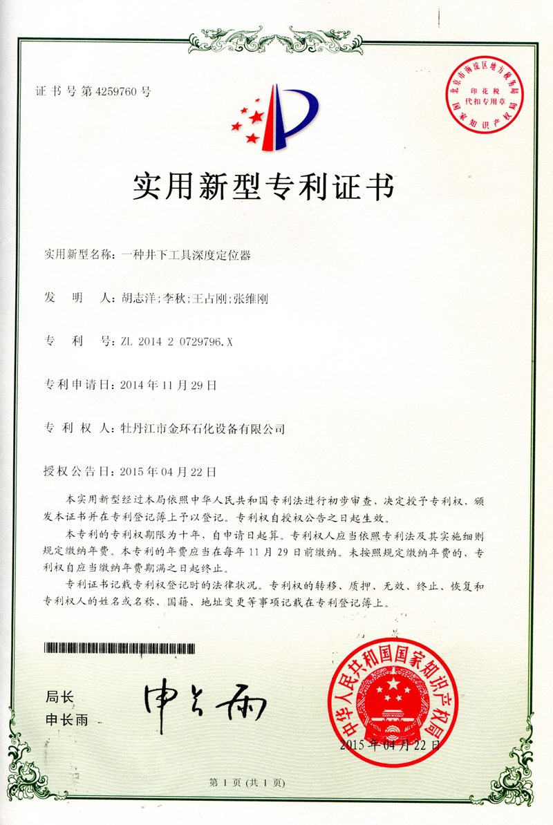 一種井下工具深度定位器實用新型專利證書ZL 2014 2 0729796.X
